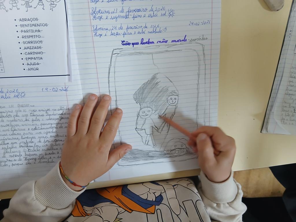No dia 25 de fevereiro, e porque as histórias nunca são demais, aproveitamos para ler o livro “Cão que ladra não morde”, aos alunos da turma 2,3P da EB de Polvoreira. Uma história divertida, e através da qual exploramos vários provérbios. Os alunos escolheram o excerto que mais gostaram e fizeram uma pequena ilustração!