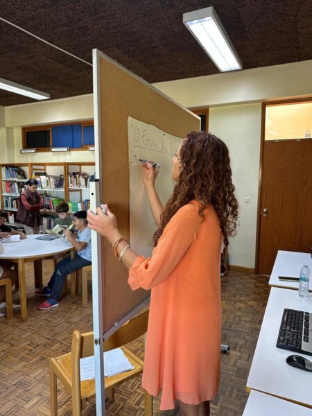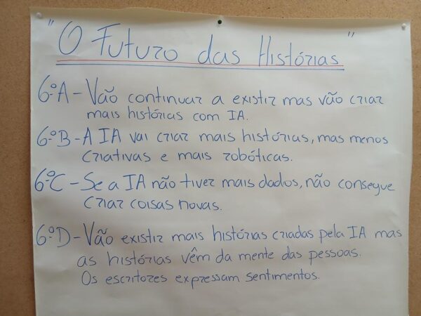 No dia 10 de outubro dinamizamos a atividade “O Futuro das Histórias”, recebemos os alunos do 6ºB e 6ºD. Os alunos escolheram histórias ou excertos e poemas de livros disponibilizados pela biblioteca e criaram outras com IA (ChatGpt) sobre o mesmo tema. Os grupos leram a história inicial e comparamos com a história ou poema criado pela IA. Em grande grupo, debatemos sobre o futuro das histórias, se os escritores irão desaparecer e outras questões. No final das sessões, registamos num mural as frases com as opiniões sobre o futuro das histórias, das 4 turmas do 6º ano.