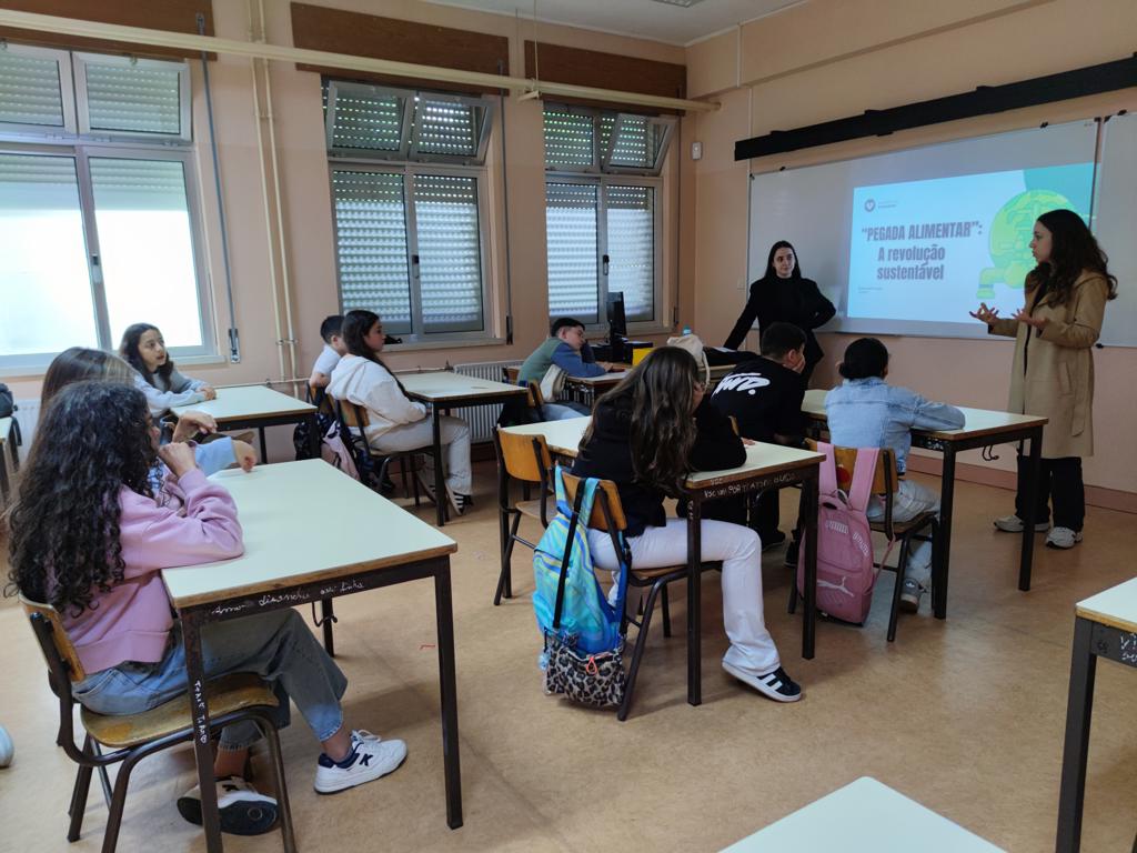 No passado dia 19 de maio, teve lugar a sessão “Pegada Alimentar: a Revolução Sustentável”, promovida pelo Departamento de Educação, da Câmara Municipal de Guimarães em articulação com a disciplina de Educação Moral e Religiosa Católica. Os alunos e alunas do 6.º A participaram com empenho e entusiasmo, enquanto as Técnicas responsáveis pela sessão abordaram os conceitos de sustentabilidade alimentar e escolhas alimentares conscientes, evidenciando a sua estreita ligação. Esta abordagem holística destacou a importância de adotar práticas que promovam simultaneamente o bem-estar individual e a preservação do planeta.